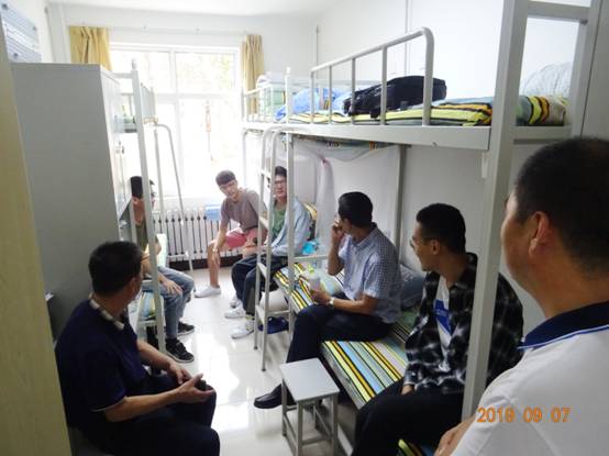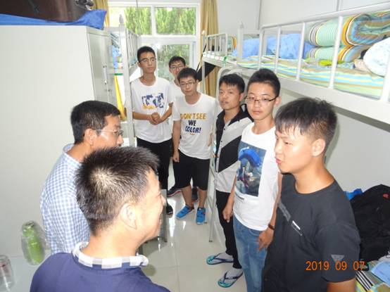 在浏园B座化工专业某男生宿舍,6个同学中有五个都来自非沿海城市。赵书记说,各位来自五湖四海,能聚到一起是一种缘分,一定要好好珍惜,好好相处。张院长则对他们的学习、生活方面表示关怀与问候,鼓励新生努力学习,并对男生们提出几点要求,要求他们遵纪守法,克己自律,杜绝沉迷于网络游戏的恶习。