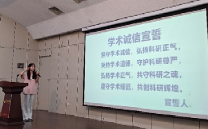新生代表朱文静同学上台,带领全体新生高举右拳,以铿锵之声许下恪守学术诚信的坚定承诺:“坚守学术诚信,弘扬科研正气;秉持学术道德,守护科研尊严;弘扬学术正气,共守科研之魂;遵守学术规范,共创科研辉煌”。铮铮誓言,回荡在整个会场。学术诚信宣誓不仅彰显了新生们坚守科研底线的决心,也展现了他们追求真理、锐意进取的精神风貌。