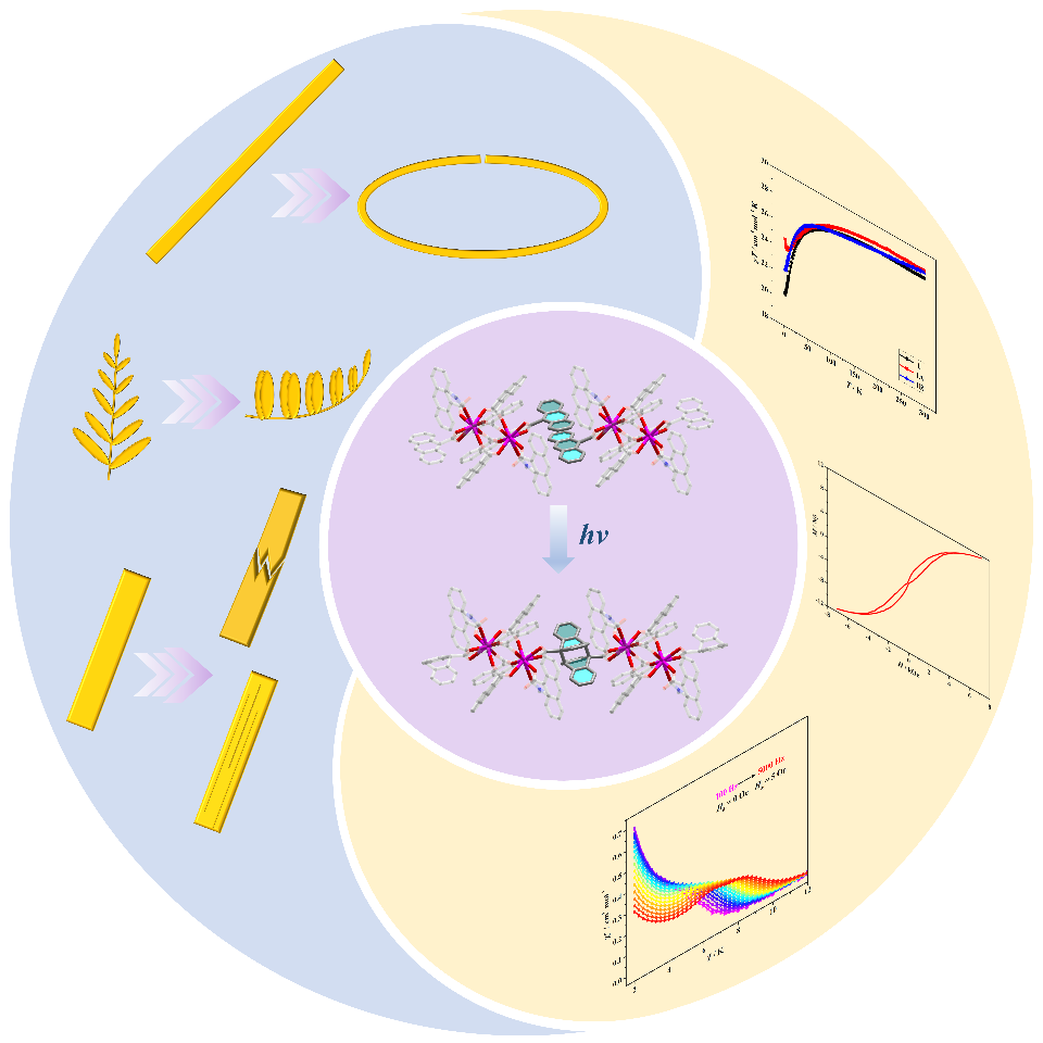 在功能分子领域,集成光磁开关与光机械运动于单一体系是长期面临的重大挑战。其核心在于“刚柔矛盾”:单分子磁体需要刚性、对称的配位环境以抑制量子隧穿效应,而光机械响应则要求结构柔性与动态化学键以实现光致应变。这一结构需求上的冲突,使得兼具高效光磁开关和显著光机械运动的材料长期难以实现,尤其在单个分子层次上实现两者的结合仍是空白。针对这一难题,研究团队在前期研究工作(Nature Commun. 2022, 13, 2646; CCS Chem. 2023, 5, 865; Research 2024, 7, 0411)基础上,创新性地运用分子工程策略,设计合成了基于光活性9-蒽甲酸配体与三价镝离子的双核配合物分子。该设计巧妙利用蒽基团在365 nm光照下可逆的[4+4]光致环加成反应,驱动了单晶到单晶的转变,形成一维链状聚合物,成为破解“刚柔矛盾”的关键。这一反应诱导显著的分子构型变化,重构了镝离子周围的配体场,有效增强了磁各向异性,从而实现了具备磁滞回线特征的单分子磁体行为;同时,该反应产生的各向异性晶格应变在晶体中积累并传递机械力,触发晶体中的宏观跳跃运动和薄膜结构中明显的弯曲变形运动。本工作首次通过动态共价化学调控策略,展示了光对磁动力学和机械运动的协同调控,证明了分子工程是解决刚性-柔性冲突、调和自旋态与晶格应变之间动态相互作用的可行途径。