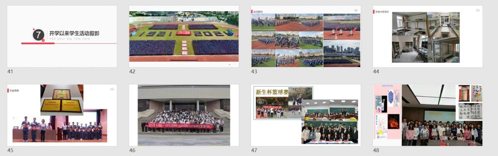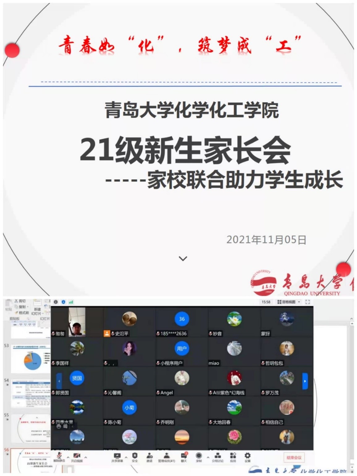 基本情况,并就学籍管理,学风建设,资助政策,奖励处分,反诈安全,心理健康和考研就业等几个模块为家长们进行了详细介绍。她建议家长多关注学生学业,并介绍了学业预警制度,保障家长对学生学习教育的知情权;同时希望家长们能积极关注孩子们的心理健康,了解他们身份转换后在陌生的环境会引发的心理适应不良等现象;提高防范意识,防范与学生相关的电信诈骗,保持与辅导员老师的沟通等。最后,通过PPT跟家长们分享了入学以来新生们参加军训和其他校园活动的照片和剪影。