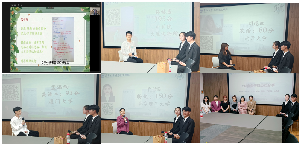 随后,11位优秀学生代表围绕研究生推免的具体流程、报考院校和专业的选择、如何制定复习计划等做了详细分享,以及政治、英语、数学和专业科目的备考策略。滢园11号楼216的六位同学作为优秀考研宿舍代表,通过几个小故事分享了良好的宿舍氛围对于考研的重要性。