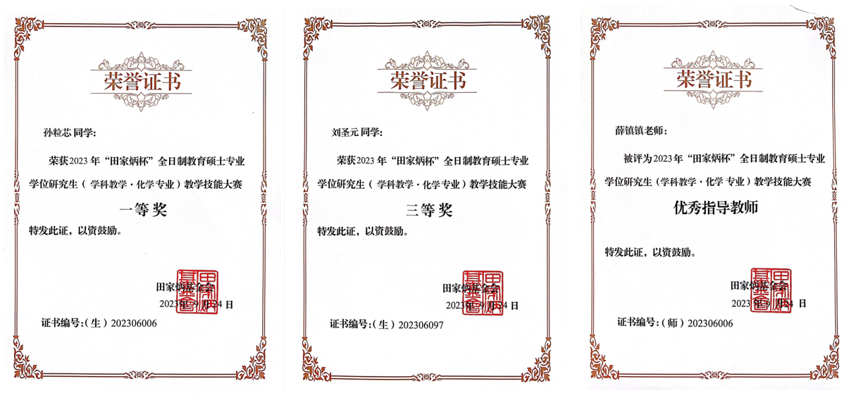 万延岚、薛镇镇老师指导的2022级学科教学(化学)专业研究生孙粒芯获一等奖,刘圣元获三等奖,薛镇镇老师荣获优秀指导教师称号。